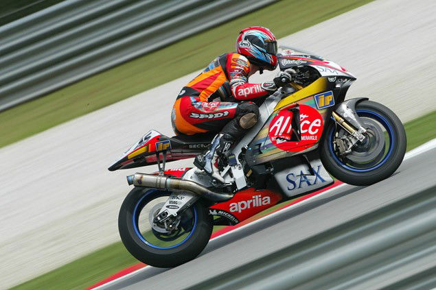Insane, crazy, mental, and terrifying; words that sum up the beast that was the Aprilia RS3 Cube. On paper the Cube was a revolution in Grand Prix bikes with a 990cc triple engine built by Cosworth and an electronic fly-by-wire throttle. The most memorable moments for 2003 were the Cube’s tendency to launch it’s rider in to the air and when the bike transformed in to a two-wheel fireball and singed the back of the Colin Edwards.