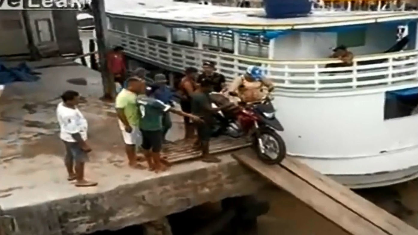 Q: How many men does it take to get a motorcycle on a boat?