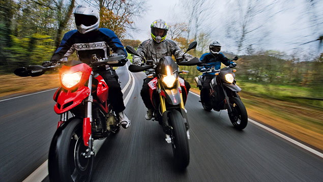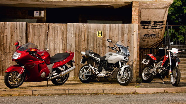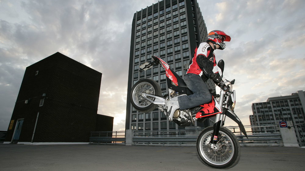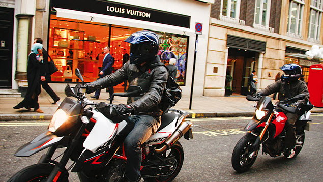 Jewel Sport - KTM 990SMR v Aprilia Dorsoduro As a time and motion study, jewellery heists are a pretty profitable blag. What do you need? Simple innit, two fast, thuggish supermoto bikes with plenty of V-twin stomp. A KTM 990SMR and Aprilia Dorsoduro should be enough to get the job done