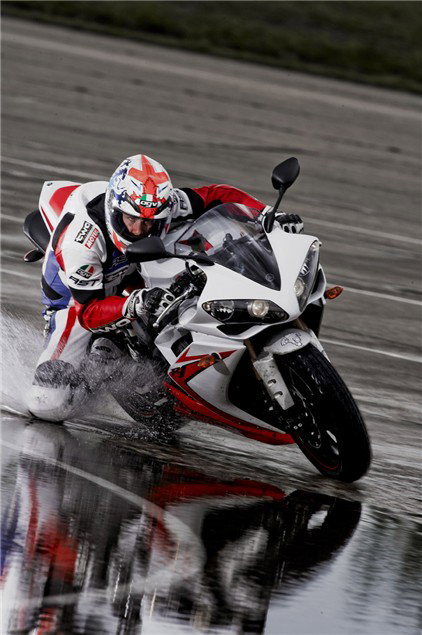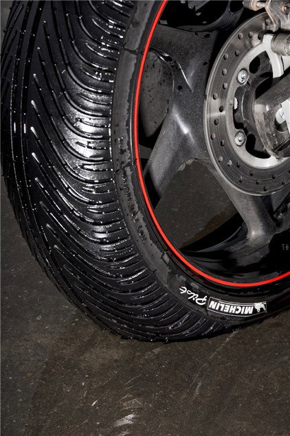 Not legal, but the chances of getting a tug for these incredibly grippy, hugely-treaded wet-weather monsters is slim. For our cover shoot we used a set of monsoon-spec Michelins, which allowed James to bury his knee in one-inch of water on sodden ground. The bike feels horrible in the dry, the tyre-blocks move all over the place, and the rear tyre will shred within 400 miles on a big sportsbike if it isn't raining. But no tyre on earth warms up as quickly or gives you as much security in the wet.