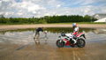 Even with Michelin monsoon tyres fitted, you still need a fair modicum of skill to pull this off. Whitham was circulating for about five minutes to warm the rubber before cutting right into the wet stuff. The front pushed hard several times on overbanding, but the tread blocks of the front tyre are designed to re-grip as they distort. James was hanging right off the bike, but the knee was going down and staying down.
