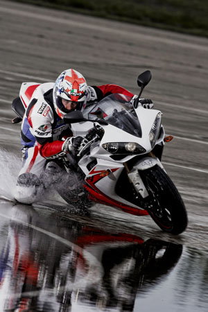 Staying smooth is the key. Your braking and throttle openings should be considered and much more gradual than in the dry. This avoids the chances of spinning the rear or losing the front. On the way into corners, brake in a straight line and build up pressure as the front tyre squashes into the road. On the way out, feed throttle in as the bike approaches upright and be prepared for it to spin a little.