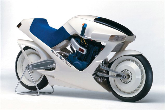 In 1985 Suzuki produced this concept, the Falcorustyco. Really? It had a 500cc square four water-cooled engine with 16 valves and 3 camshafts, no gearbox and relied on hydraulic pumps to provide final drive to both wheels. Front and rear swinging arms provided hub-centered steering and the bike had electromagnet brakes.