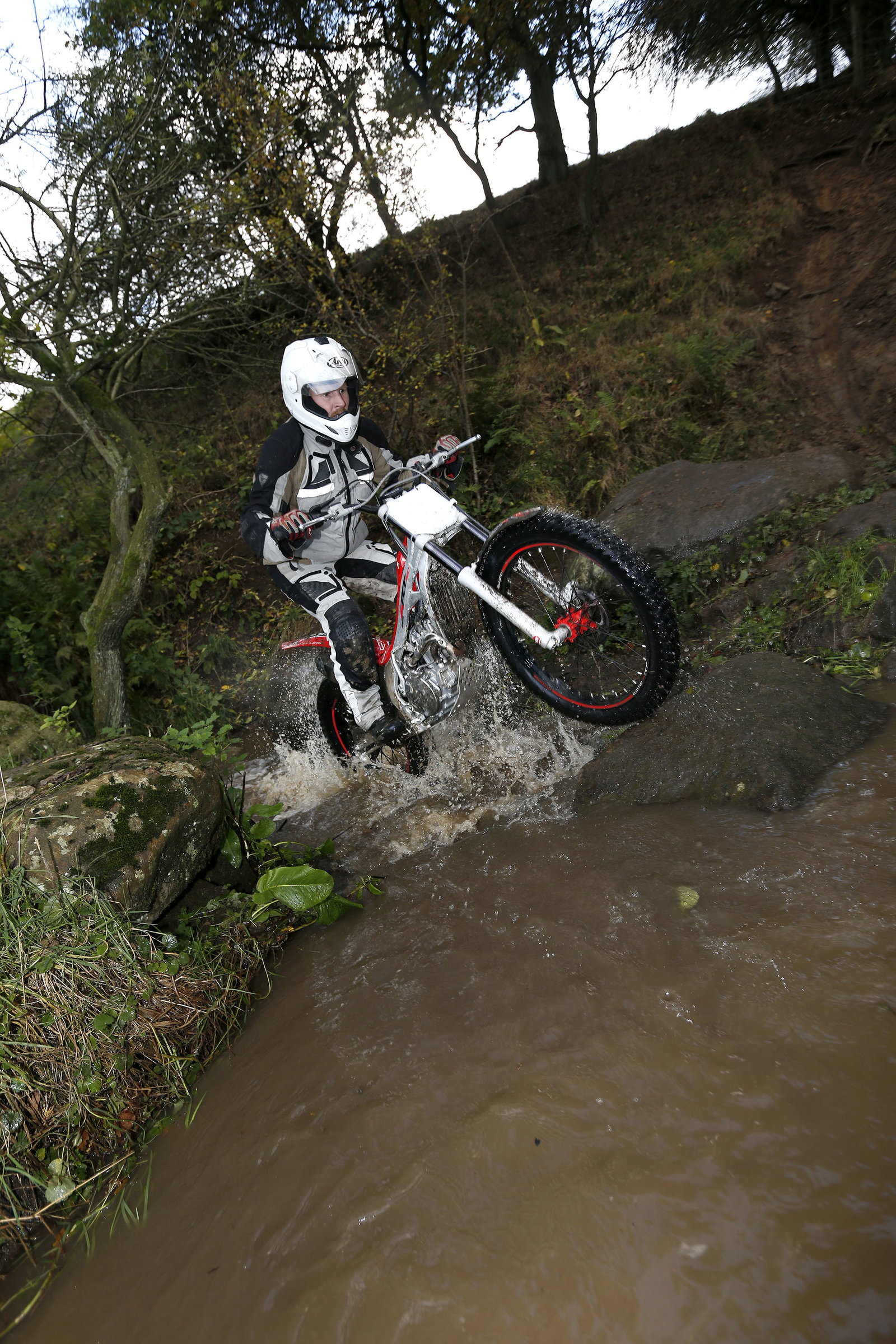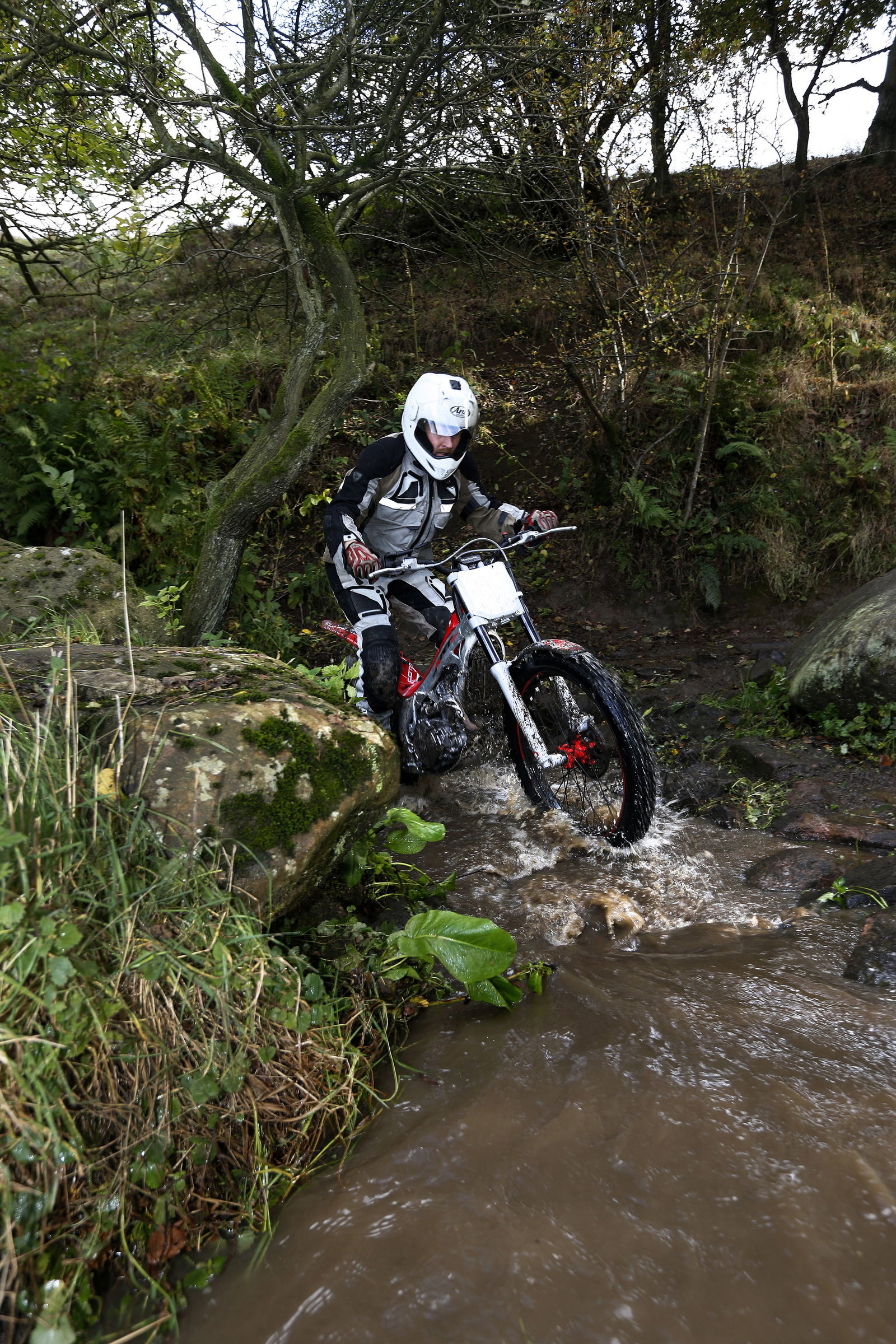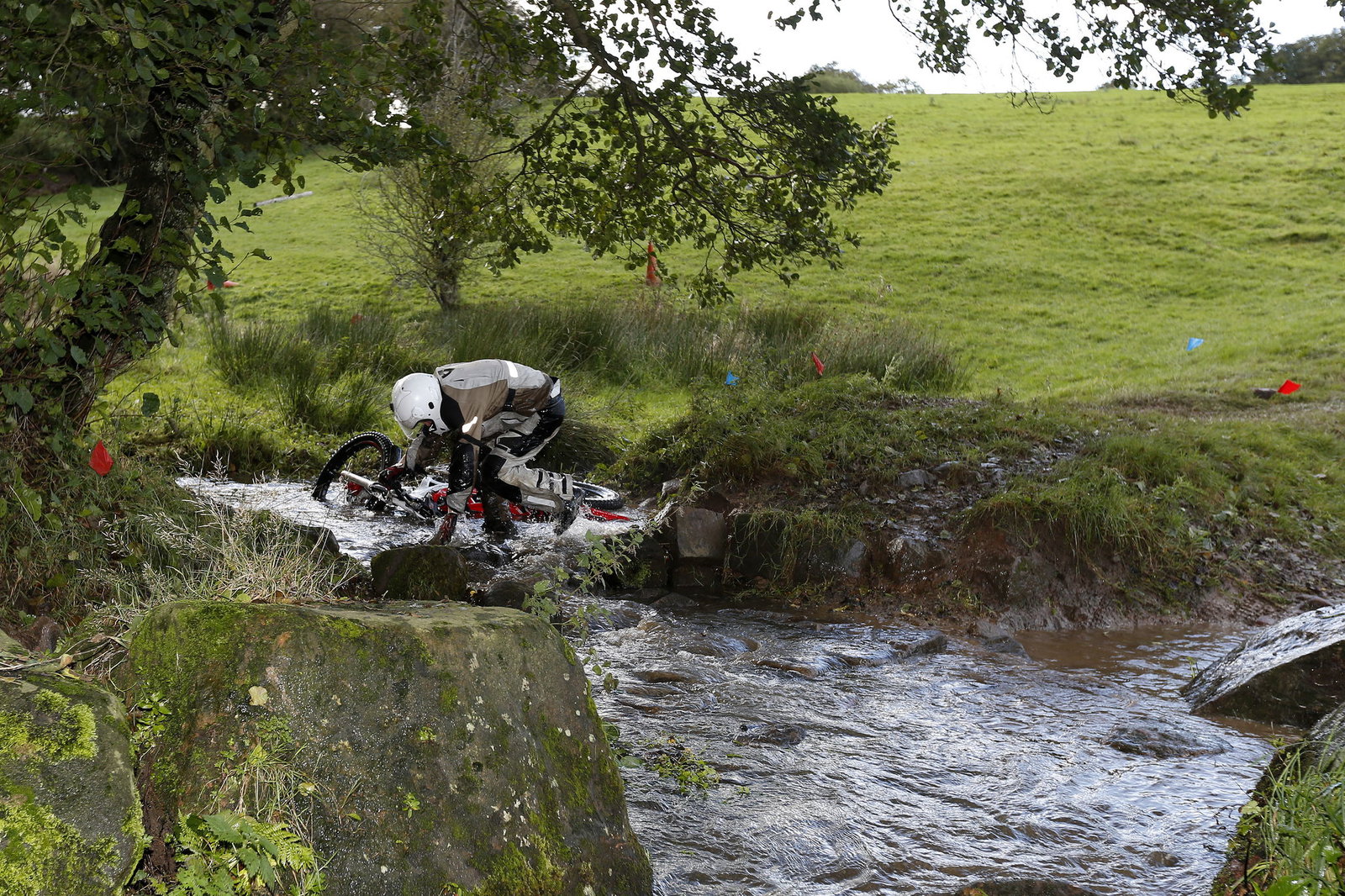After a few goes I got through without putting a foot down. The front hit a rock, bounced up in the air and down on the other side, and I still kept both feet on the pegs. On the next go, I hit the rock again, only this time the forks compressed and I came to sudden halt, putting both feet in the water.