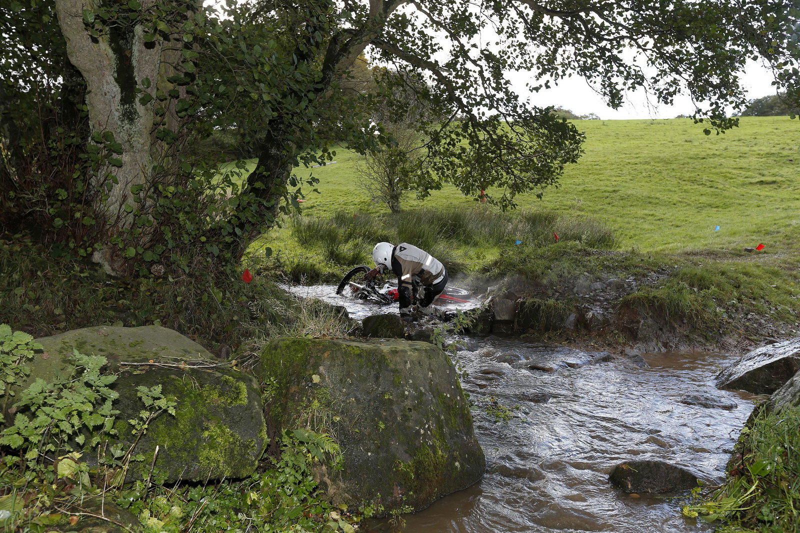 It seemed like time to have a go at riding through a stream. I almost backed out when I saw it. Proper trials riders were crossing it, ploughing up what seemed an impossibly steep climb, going around a tree and descending. I wasn’t going to do that. Not in this lifetime.