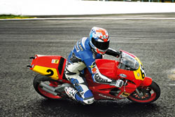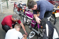 ![]() ![]() ![]() ![]() ![]() ![]() ![]() If you’ve been a reader of the mag for any length of time you can’t have failed to notice that as well as my love of modern bikes, I have an unhealthy interest in older ones. Particularly 1970’s two-stroke stuff. Every year me and a bunch of similarly afflicted mates will wobble off on at least one ill-advised run aboard an assortment of smokey old LC‘s, X7‘s and GT‘s in an attempt to re-live our youth and double our carbon footprint. A couple of years ago we did a 400 mile, 3 day tour of the North on ‘70s mopeds. Despite the fact that up some of the hills we were moving slower than the cattle grazing in the fields at the side of the road, and despite the fact that even on the flat, with your chin on the tank, your left hand on the fork leg and a tail-wind, 50 mph is all you can hope for, we were all surprised how much ground you can cover on ’em if you keep going. Another shock was how much we all enjoyed trying to coax the best out of these thirty year-old little two-strokes. Consequently, after several beers one night, someone amongst us suggested we get a little bit more adventurous this year. Then, after more ale someone else came up with the idea of riding the mopeds out to the Spa circuit (that’s Spa in Belgium not Boston Spa) for the annual bikers classic meeting, the biggest gathering of classic racing bikes in Europe. As soon as we started to tell people of our scheme they’d laugh so hard their nuts would fall off. Well, apart from any women of course, they just laughed very hard until they wee’d. It then became a point of honour to make it happen. I’d managed to then heap a whole load more pressure on us to get there at all costs by agreeing to take part in the legends’ parade around the sublime Francochamps Circuit when, or indeed if, we arrived. A couple of tasty, and very rare old GP race bikes were set aside for me to ride, one being a 1989 ex-Randy Mamola 500 Cagiva and the other an ’83 ex-Wayne Gardner RS500 Honda. Iconic bikes that you can normally only dream about riding. Oh, and both priceless... The plan was as simple as it was ambitious, we’d set off from Huddersfield on the Thursday morning and head for Hull, where we’d take the overnight ferry to Zeebrugge riding on to Spa during Friday, spend all weekend watching, and for me riding some even noisier, smellier, and rarer old strokers round the track and then re-trace our steps arriving home Tuesday in time for tea and crumpets. Bearing in mind that these simple devices were designed to carry scrawny, acne ridden 16 year-olds as far as the nearest chip shop or school disco, we figured if we burdened these little bikes with luggage as well as our amply nourished, middle-aged bodies most of ’em wouldn’t have actually moved at all, so we had a dedicated accomplice, Gav, follow us in a van. This allowed us to take assorted spares and several tubes of pile cream that we’d inevitably need as well as enabling us to bring back any dead bikes that didn’t go the distance. The seven ’ped pilots were bike shop owning brothers Jamie and Jason riding a Suzuki TS50 and an AC50 respectively, their cousin Marcus on a Kriedler “Floret”, publican Mike on a Suzuki AS50, Boff on an AP50, and Steve, like me, on a Fizzie. The youngest bike being 30 years old and the oldest 38. Just two (yes, that’s two) miles into a round trip of over six hundred we had our first mechanical failure, when a foot long piece of Steve’s FS1-E silencer broke off and went bouncing down the road. Even the most pessimistic estimates of our sceptics had us getting a bit further than this before big stuff started dropping off the bikes. In itself it wasn’t a big problem, we had a spare in the van and had it fitted in 10 minutes, but if this had set the tone for the whole trip we wouldn’t make the boat, and if we didn’t make the boat there would be no way we could get to Spa in time for me to ride the race bikes. The technique to getting from A to B as quickly as possible on these things is totally different to the way you ride any modern bike. These days you get used to having so much excess power at your disposal, the bike’ll go pretty much as fast as you want, and in most cases a lot faster, so you spend most of your time looking for cameras and trying to stay within the speed limits. With a 4bhp ‘sports moped’ (I never did understand that term) how you ride it makes a huge difference to how fast it’ll go. On a flat road sat upright the fizzer would do 40mph, if you put your feet on the rear pegs and your chin-piece on the tank you could get 47mph, and if you could get in the slipstream of something the speedo would show anything up to 55mph, obviously depending on what vehicle you were stuck up the arse of. Speed limits aren’t so much of a problem, we slowed down for the villages but most of the route to Hull was on A roads with a 60 limit. These wouldn’t do 60 if you hurled them off a cliff! Two or three mopeds will always go quicker than a single one by helping each other with moving the air. Any cyclist knows the benefits of being in a group and sharing the work. Once you dropped more than about ten yards behind our little ‘peleton’ you could feel the revs dropping and the bike slowing down. After that no matter how tucked in you got or how much you stretched the throttle cable, all you could do was watch as the group inched away. After the false start with the broken exhaust none of the bikes missed a beat on the rest of the run to Hull, the only stops were to gas up a couple of times and occasionally look at the map to make sure we were going the right way. The last five miles to the ferry terminal (that’s 20 minutes on these things ) we rode through a thunderstorm of biblical proportions, and arrived at check-in looking like drowned rats, and with tickets resembling pulp, but on time, and with a real sense of achievement. We disembarked the 