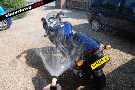 It's a good idea to rinse your bike before going at it with the shampoo. I rinse down my bike with a standard hose, building up pressure using the age-old 'thumb over the end' technique. The front-end of the bike and tail-piece tend to be the areas that accumulate muck, so hose them down first and make sure the whole bike's been lightly rinsed.