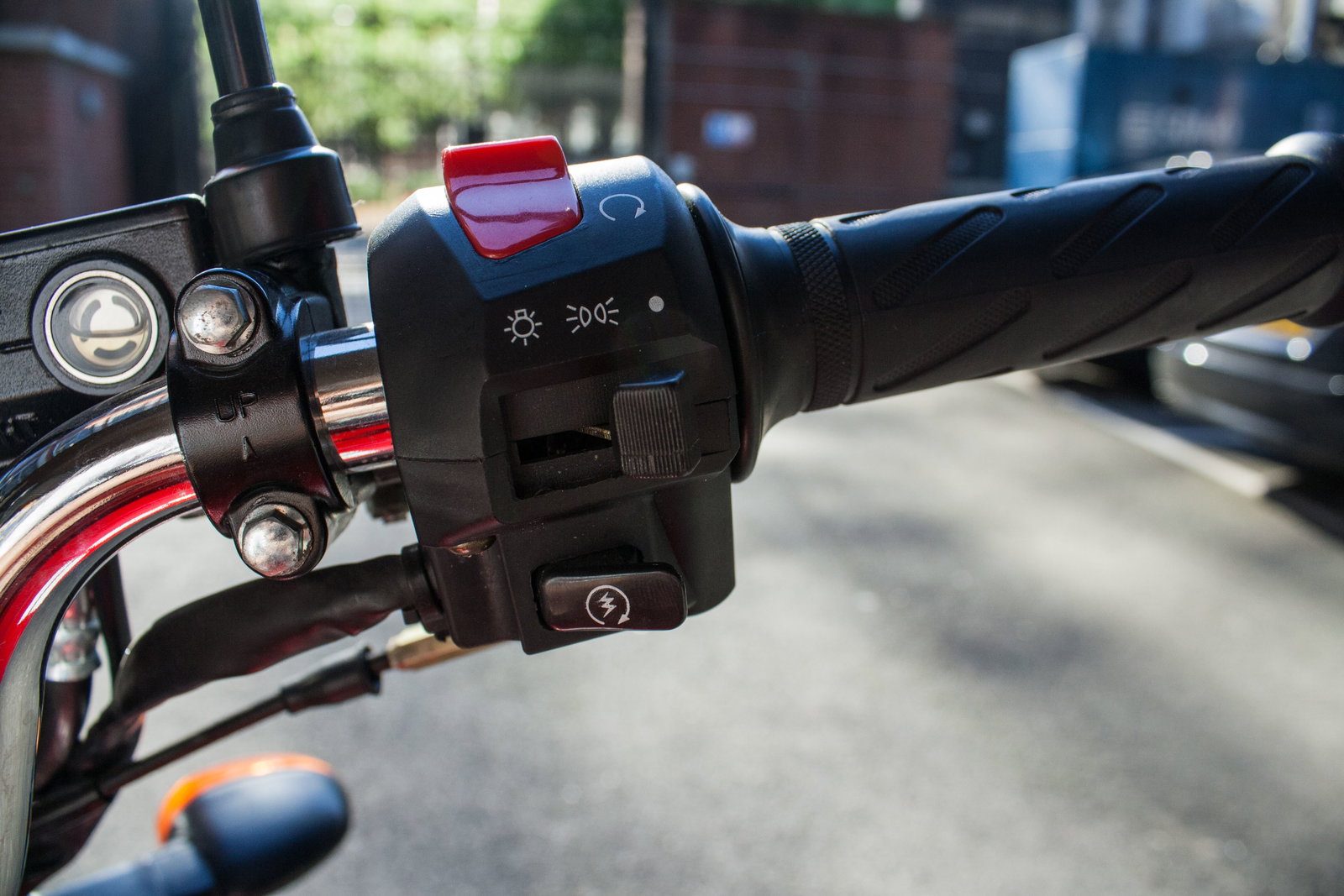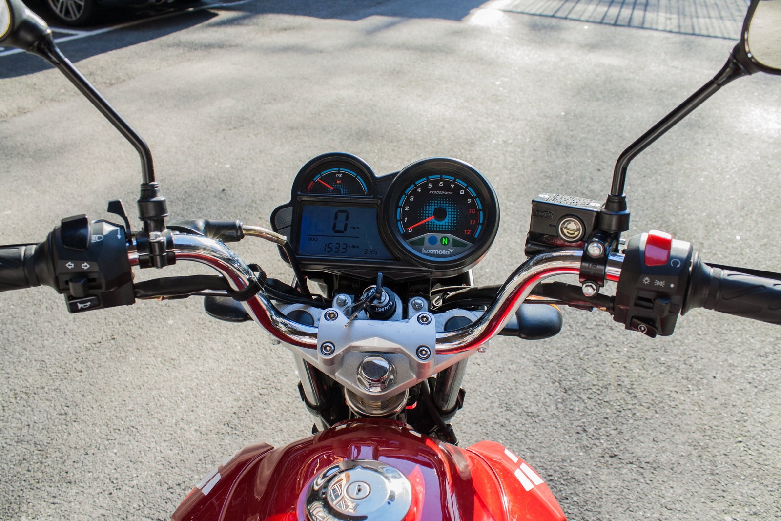 I mentioned that the ZSF has a gear indicator on the dash, which I wasn’t expecting for just over £1k. The dash itself is basic, functional and clear, with speed and revs easily visible at a glance. It was a pleasant surprise when I first turned the ignition on and saw the rev counter even sweep round to the 12,000 rpm redline before settling back to zero. It’s the same story with the bar switches, which all works nicely and feels like good quality.