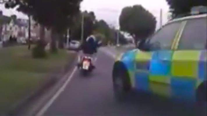 The short clip shows riders being shunted from the stolen scooters