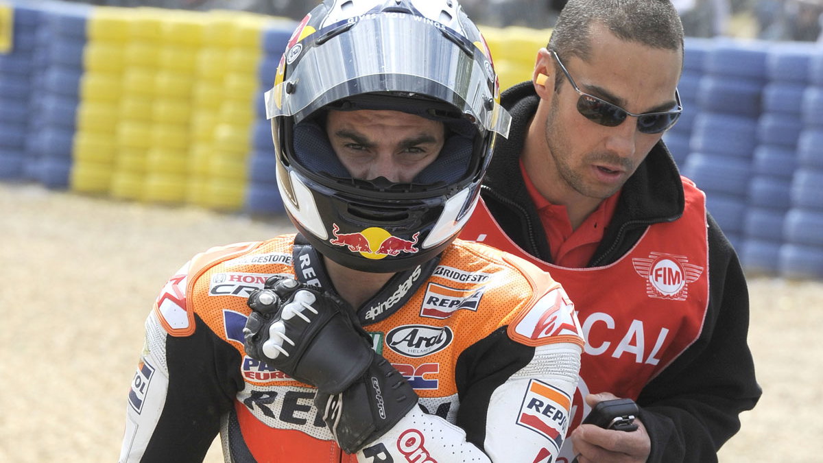 Repsol Honda rider suffers a broken right collarbone in the Le Mans crash