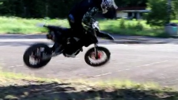 This time one of the members launches his bike into an epic 360 stoppie over a four-foot mound of grass - fully clearing it. This new stunt is similar to an old one, where the same rider on his KTM 640 supermoto 360 stoppies a low lying chain fence. However, this latest effort is bigger and better.