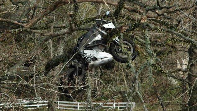 Motorcycle stuck in tree after crash