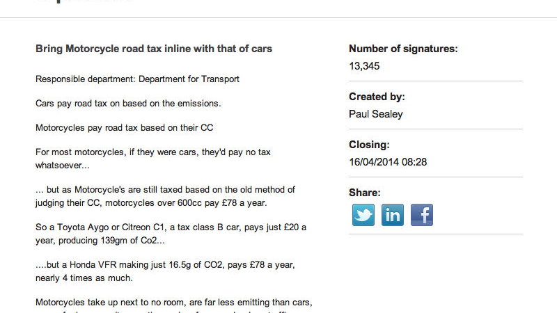 E-petition demands motorcycles be taxed in the same way as cars